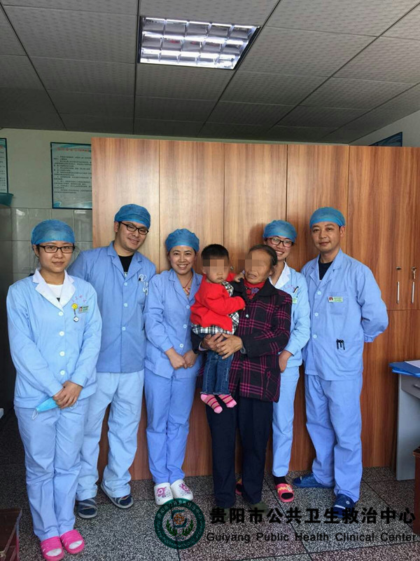 出院時奶奶抱著孫女和醫(yī)務人員合影