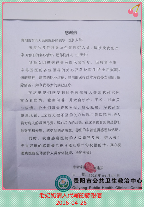經(jīng)過科室的精心治療和護理,孩子終于可以康復出院了。臨走之前,醫(yī)務人員專程給她買了新衣服,科室捐了1000元交到奶奶手中。病房的其他家屬也被醫(yī)生護士們的行為感動,你50元 ,我100元,紛紛把錢塞到奶奶手里。出院后,老奶奶請人代寫了一封感謝信送到科室,字里行間都是對科室的感激和祝福。
