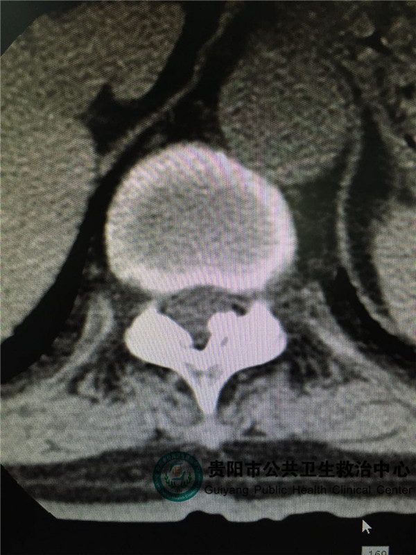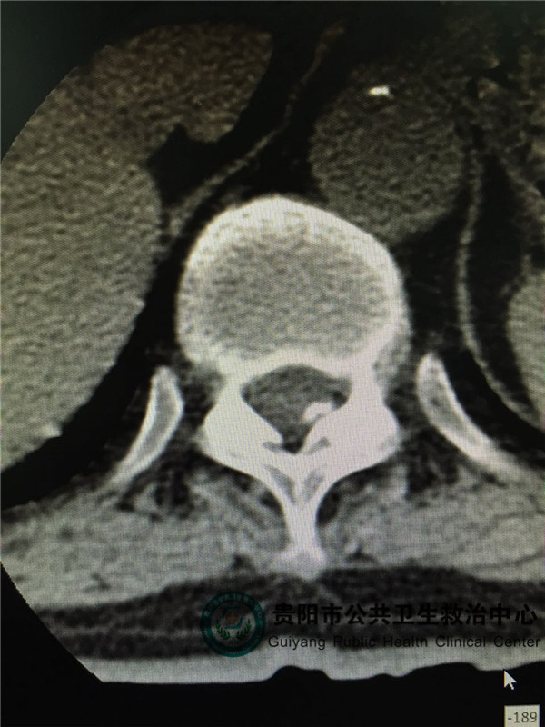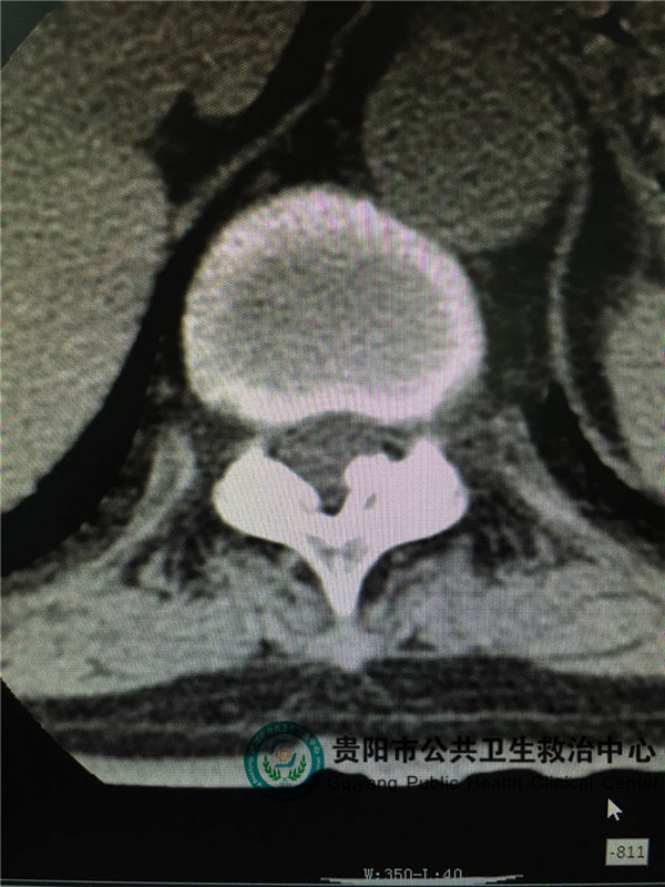 圖2,圖3,圖4是胸椎病灶節(jié)段CT平掃,可見(jiàn)椎管左側(cè)有占位壓迫脊髓,椎管明顯變窄。和患者體征相符。