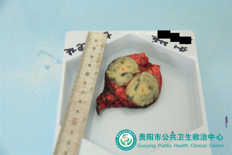 手術經(jīng)過:麻醉生效后,患者取左側臥位,取右側第4肋腋前線為手術切口,長度約4cm,進入胸腔,胸腔鏡探查胸腔無粘連,并予右肺上葉后段探及直徑約3cm質(zhì)韌腫塊,胸膜表面無結節(jié),余肺未探及明顯病變,予直線切割吻合器沿病灶組織連同少許正常肺組織行楔形切除,完整切除病灶,送冰凍切片回示:結核。手術用時僅半小時,出血約5ml,單一切口約4cm,術后第一日即達到出院標準。