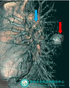 3D-CT重建圖精確地顯示了患者的腫瘤形態(tài)(紅色箭頭)、氣管和血管的解剖狀態(tài)(藍色箭頭)