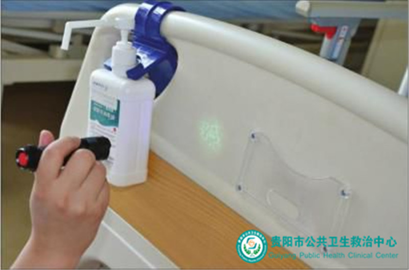 院感科在了解到臨床的困惑后,通過(guò)借鑒其他醫(yī)院的經(jīng)驗(yàn)引入了熒光筆+紫外線,一支小小熒光筆,竟有如此大用處。在保潔人員清潔工作開始前,對(duì)患者診療區(qū)域內(nèi)高頻接觸的環(huán)境和物體表面進(jìn)行預(yù)先標(biāo)記,這樣的記號(hào)肉眼無(wú)法看出,可是借助紫外線電筒,便能看得一清二楚,清潔后借助紫外線燈檢查標(biāo)記是否被有效清除,以考核環(huán)境清潔工作的質(zhì)量。