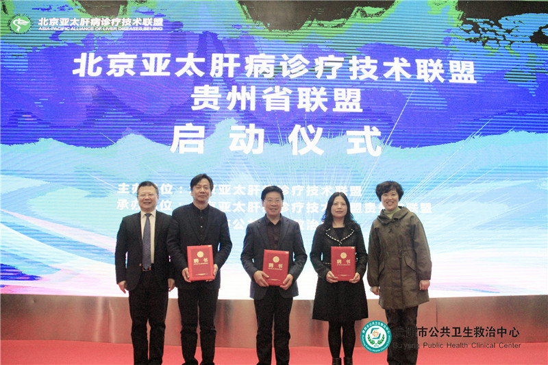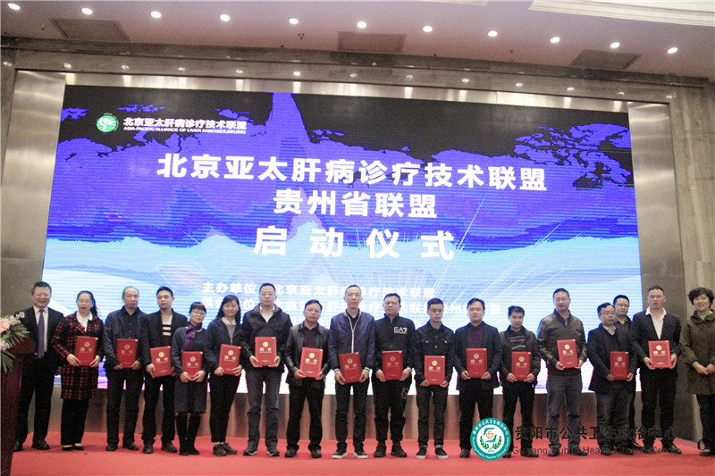 首都醫(yī)科大學(xué)附屬北京地壇醫(yī)院、貴州省人民醫(yī)院、貴州省醫(yī)科大學(xué)附屬醫(yī)院、貴陽(yáng)市公共衛(wèi)生救治中心及醫(yī)聯(lián)體多家醫(yī)院的領(lǐng)導(dǎo)及知名專(zhuān)家參加了本次啟動(dòng)儀式。啟動(dòng)儀式上,首都醫(yī)科大學(xué)附屬北京地壇醫(yī)院副院長(zhǎng)兼北京亞太肝病診療技術(shù)聯(lián)盟理事長(zhǎng)成軍教授宣讀了聯(lián)盟成立批復(fù),并為貴州省聯(lián)盟授牌并向理事長(zhǎng)、副理事長(zhǎng)、常務(wù)理事等頒發(fā)證書(shū)。成軍教授介紹了北京亞太肝病診療技術(shù)聯(lián)盟的具體工作流程及計(jì)劃,并闡述了“中國(guó)肝病精準(zhǔn)診療2030計(jì)劃實(shí)施方案”的課題內(nèi)容。公衛(wèi)中心主任劉建西擔(dān)任貴州省聯(lián)盟理事長(zhǎng),中心副主任梁躍東博士、中心肝病科張流主任擔(dān)任副理事長(zhǎng),肝病科王軍副主任擔(dān)任貴州省聯(lián)盟副理事長(zhǎng)兼秘書(shū)長(zhǎng)。