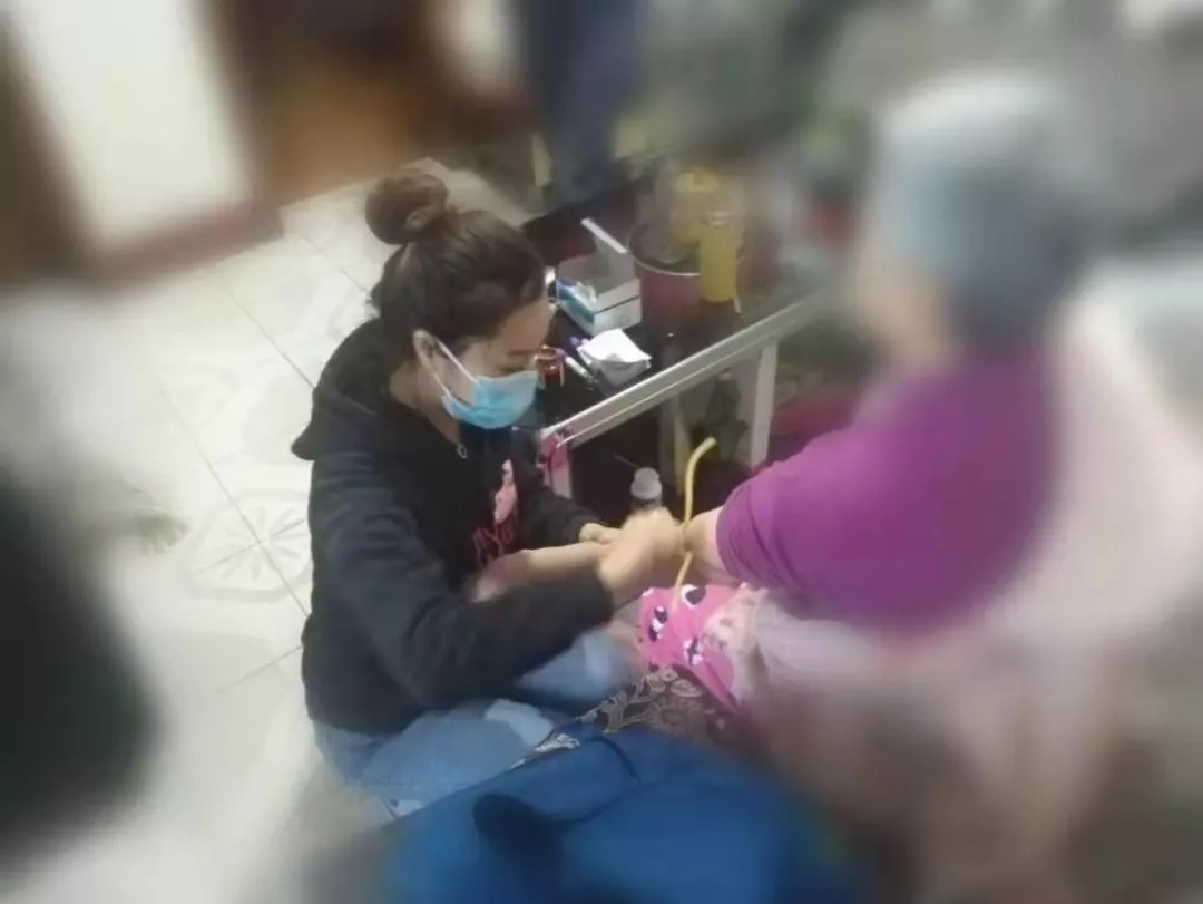 因CMV雙眼失明的楊阿姨,需要系統(tǒng)的日常護(hù)理,醫(yī)護(hù)人員來(lái)到楊阿姨家中,幫楊阿姨檢查、陪她談心。