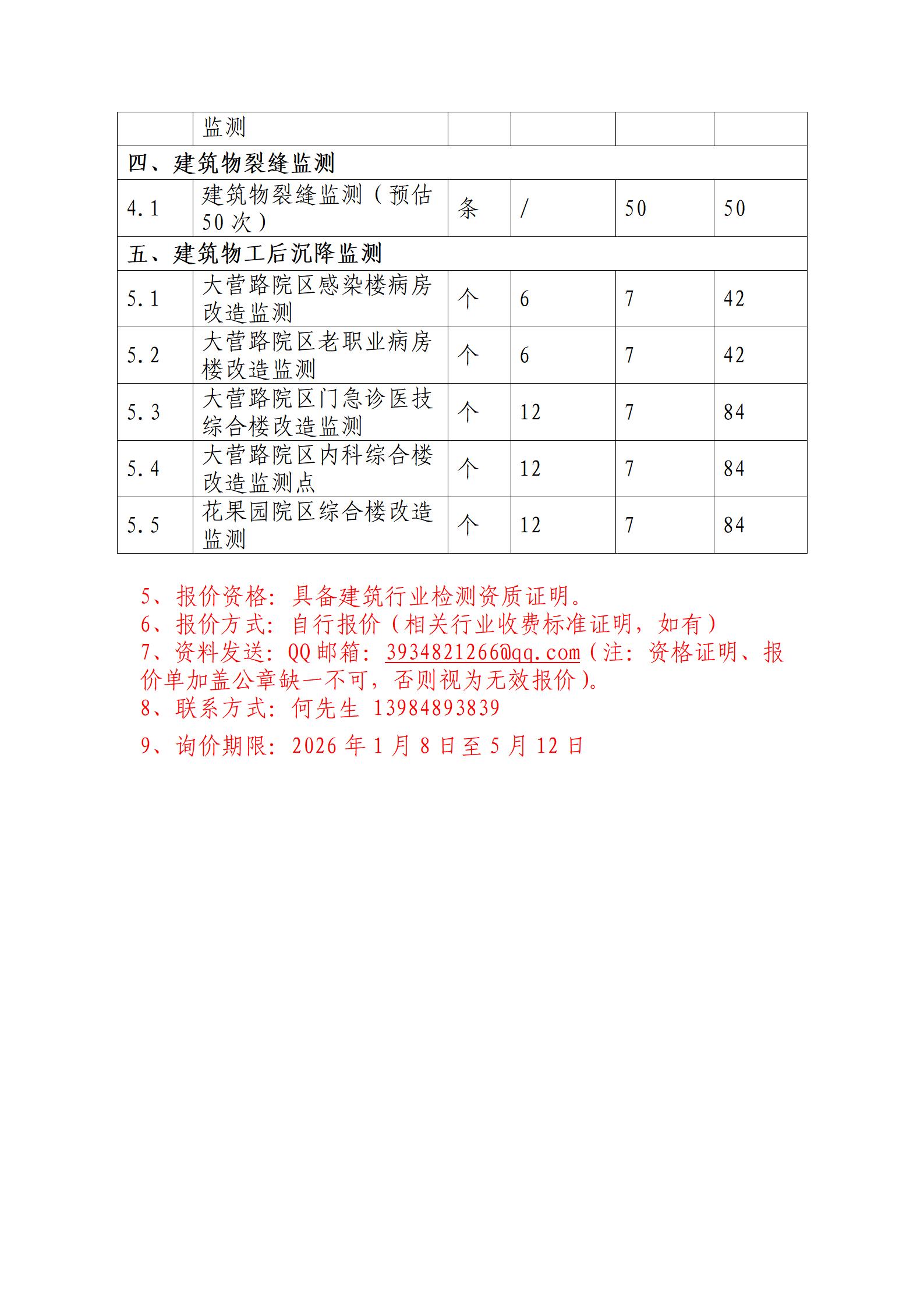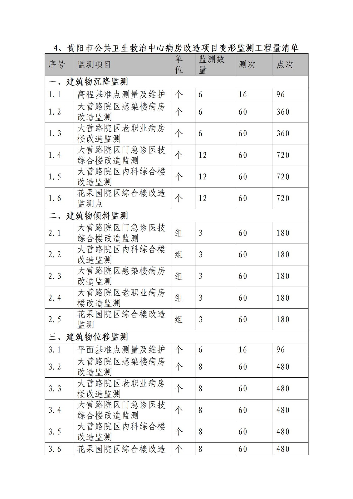 本項(xiàng)目?jī)?nèi)容包含但不限于貴陽市公共衛(wèi)生救治中心病房改造項(xiàng)目的建(構(gòu))筑物變形監(jiān)測(cè)技術(shù)服務(wù),主要工作內(nèi)容為人工監(jiān)測(cè)服務(wù)、監(jiān)測(cè)點(diǎn)布設(shè)服務(wù)、工程質(zhì)量管理咨詢服務(wù)等,并出具相關(guān)監(jiān)測(cè)報(bào)告。具體如下: